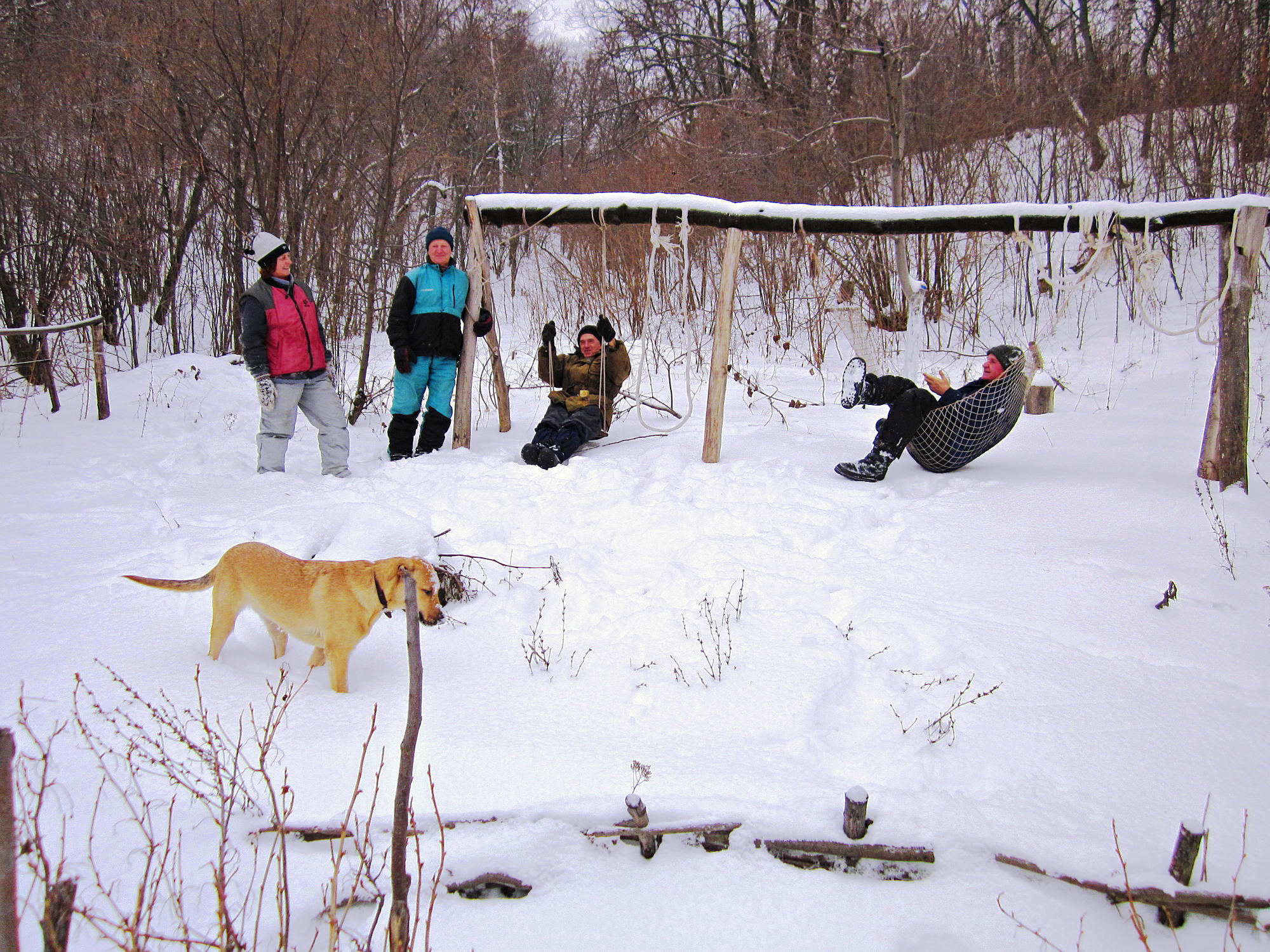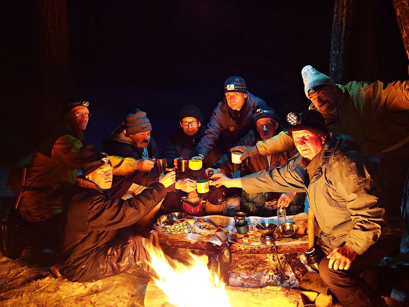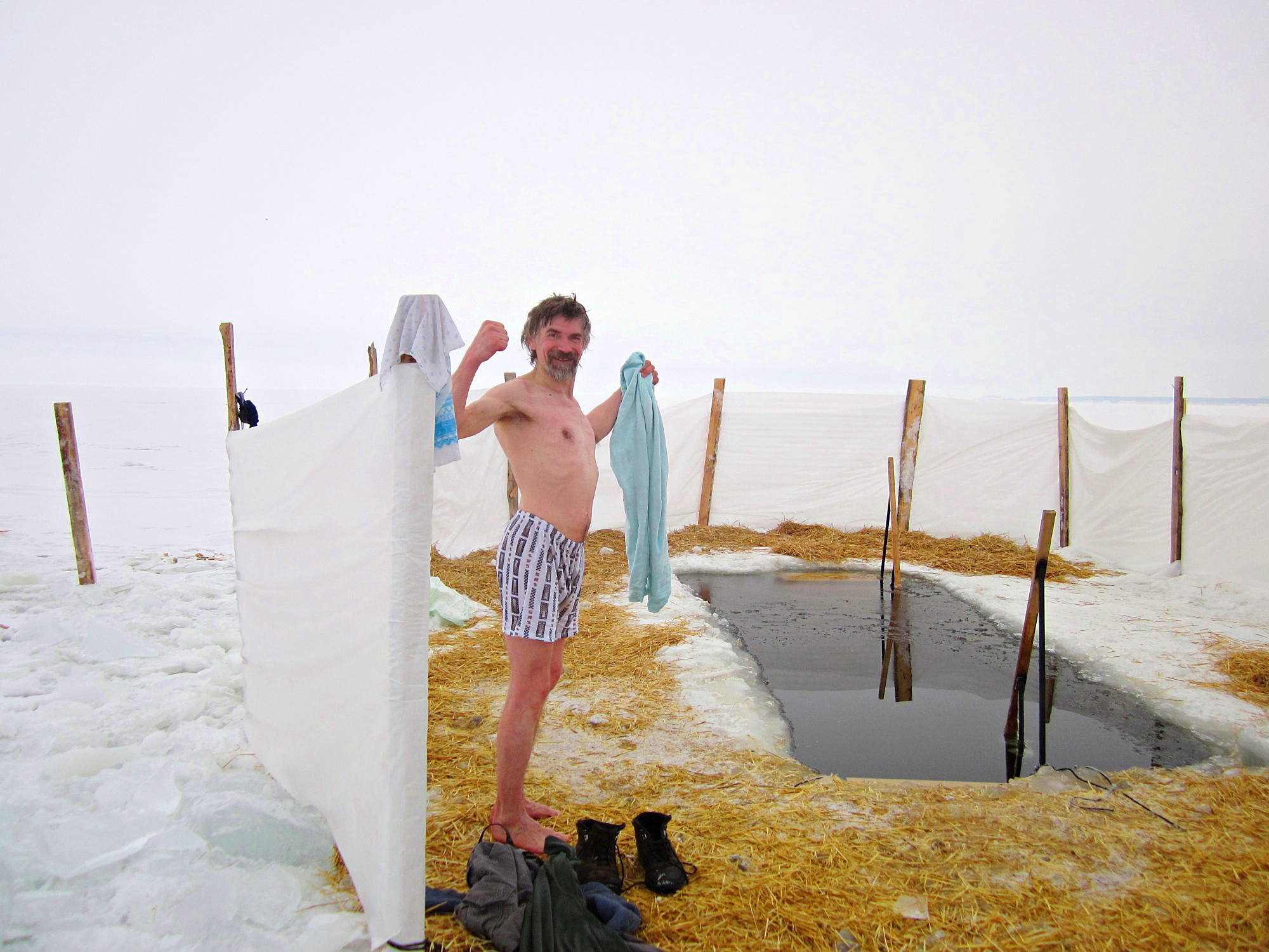 истоп хижины и бани, ужин, посиделки с Лопуховкой, крещенское обливание из ручья.