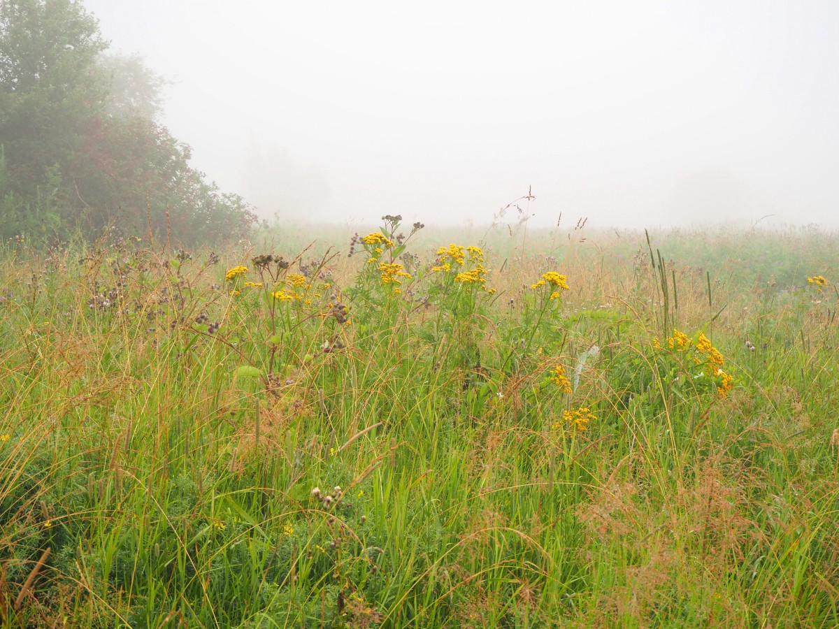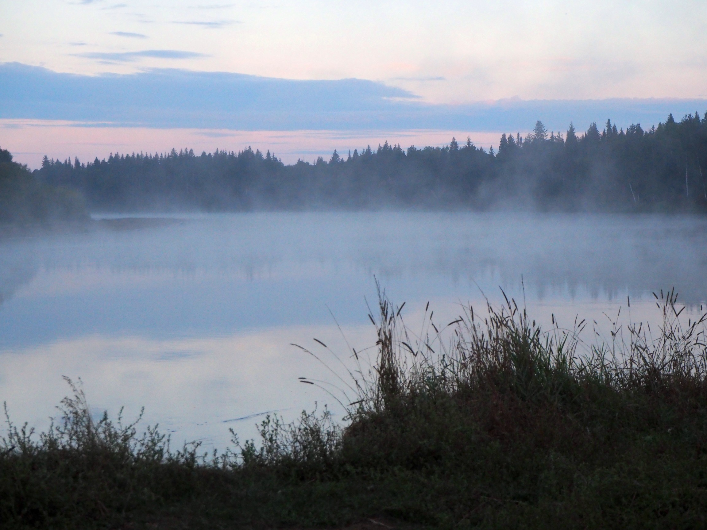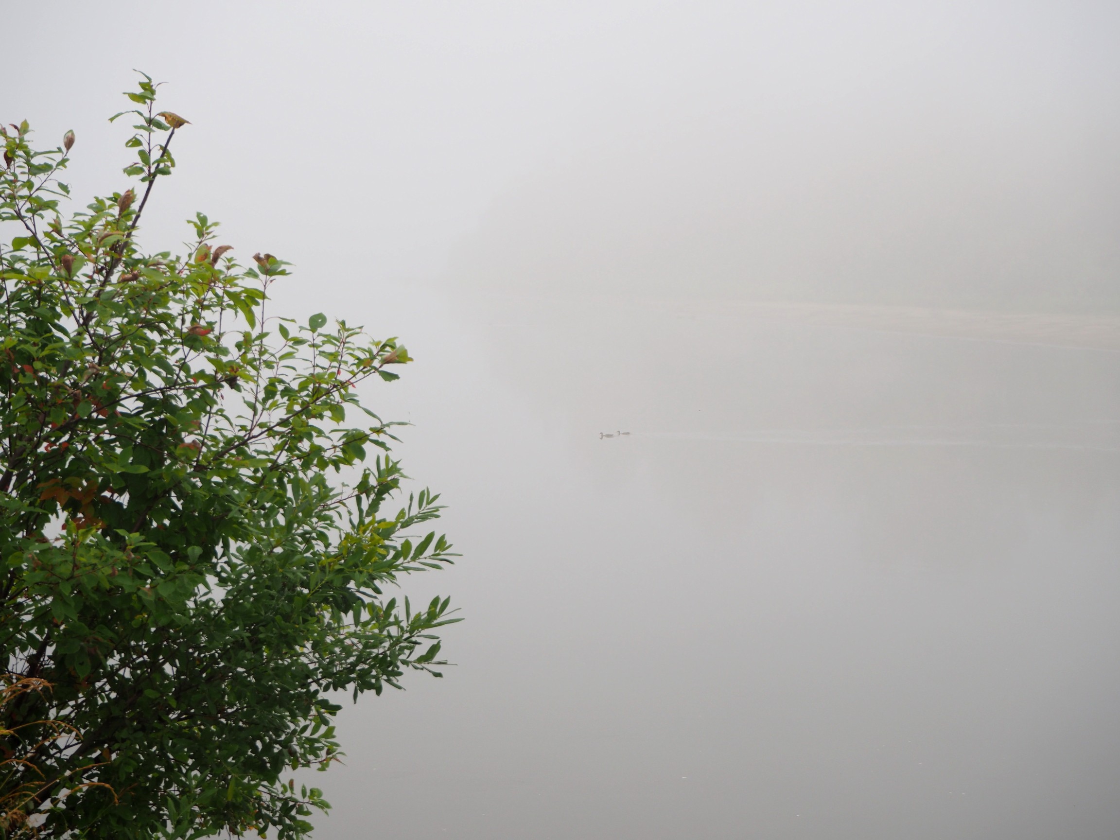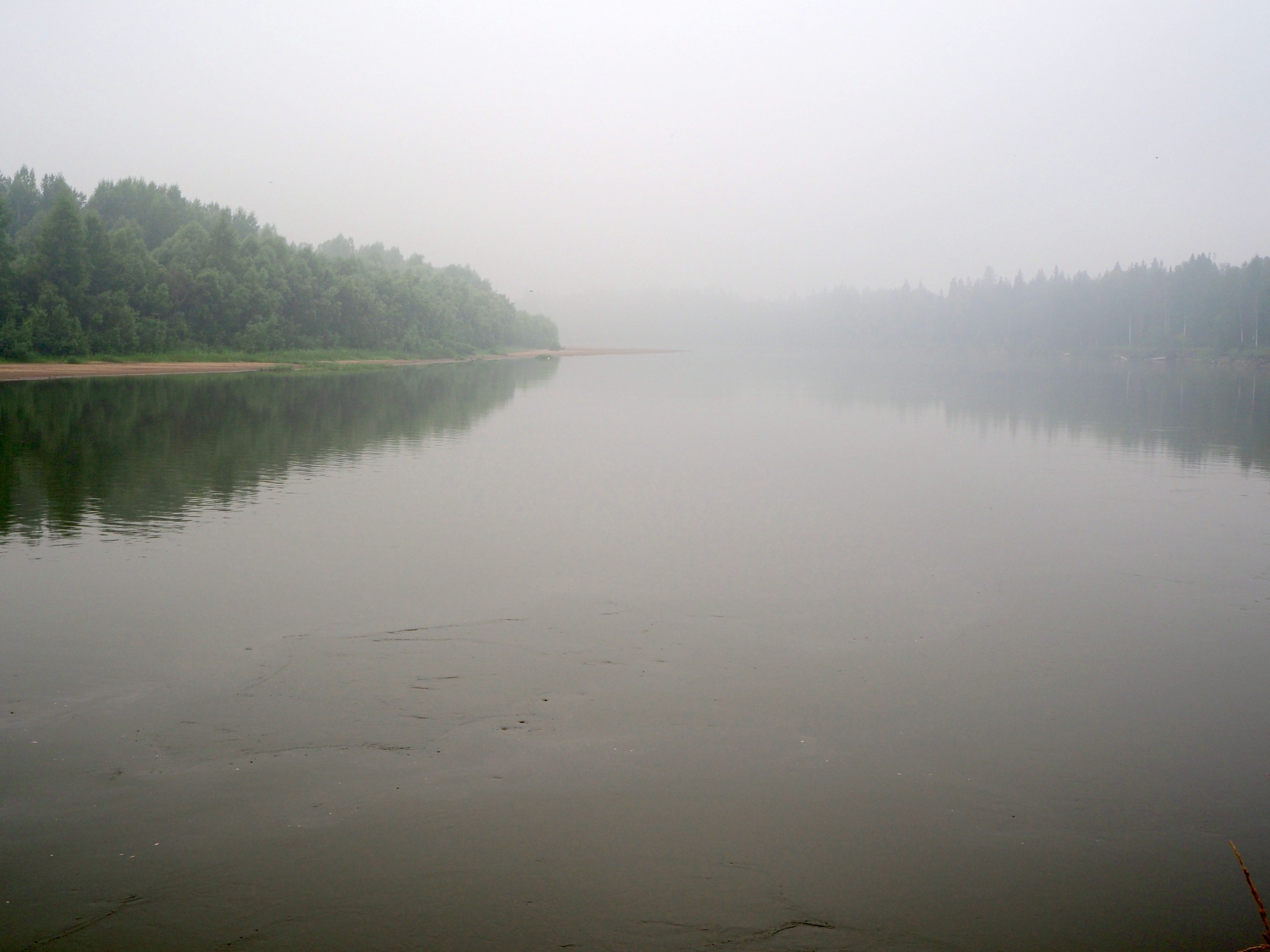 Перед нами река в тумане, за ней едва угадывался прибрежный
