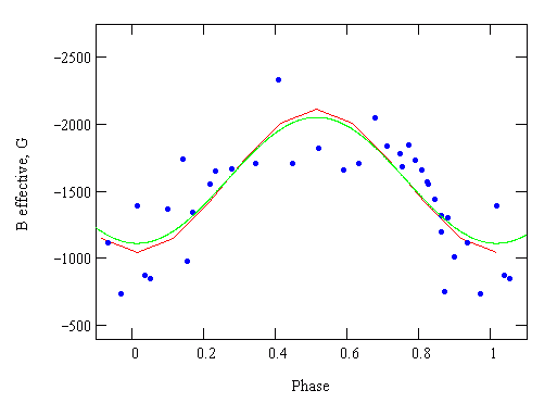 На левом рисунке приведён пример аппроксимации магнитной фазовой кривой B-звезды