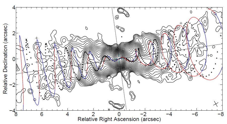 Замедление струй SS 433 не обнаружено явно, но влияет на определение расстояния до объекта и на кинематическую модель струй. Так как ни то, ни другое ещё не получили непротиворечивого определения, то вопрос о замедлении струй является спорным. Камнем преткновения является успех баллистической модели струй. Однако наблюдения свидетельствуют, что скорость струй отнюдь не постоянна. В нашем моделировании кинематики струй учтено ударное взаимодействие с окружающей средой, следующее из предположения об инжекции релятивистских электронов, отвечающих за наблюдаемое синхротронное радио излучение, в ударных волнах внутри струй – единственно непротиворечивое и наблюдательно обоснованное предположение, по сравнению с другими моделями радиоструй SS 433. В результате прецессионный "штопор" струй получает импульс не только тормозящий, но и ещё более закручивающий. Торможение происходит в основном в пределах полёта в течение первой 1/5 периода прецессии, далее струи имитируют баллистические. Аппроксимация нашей моделью (крестики на графике, на расстоянии до наблюдателя 4.8 кпк) наблюдаемого положения струй не хуже, чем баллистической моделью (цветная линия, на расстоянии 5.5 кпк; чёрная линия – баллистическая модель на расстоянии 4.8 кпк). И в отличие от последней она согласуется с наблюдательными данными об отклонении кинематики струй SS 433 от баллистической модели. На правом рисунке художественная копия левого.